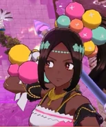 Fell Timerra looks the same as her regular counterpart. Timerra is dark skin, Wearing pink and white clothing, wears multiple colors across her body and her hair, has a black hair ponytail, wears golden jewelry across her body, a star shaped headband, and wears black sandals.