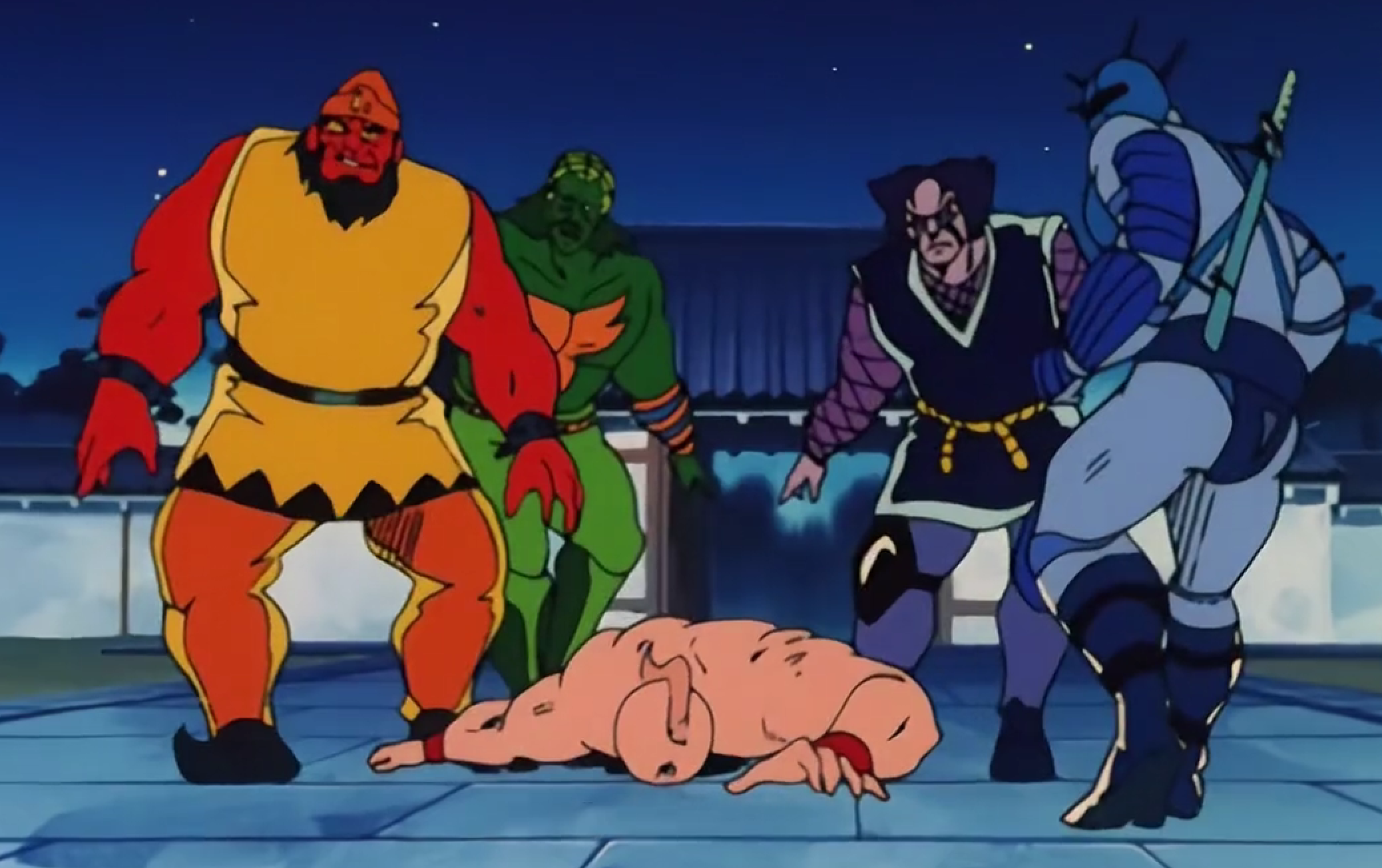 When Kinnikuman shows up in the Edo Period to battle against Shuten-Doji, he calls upon the Four Fiends who easily beat him down. The second time that the Four Fiends beat down Kinnikuman, they tie him up and throw him into a river under the orders of Shuten-Doji.