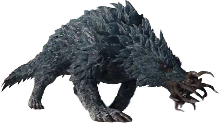 The Frost Vark is a large mammalian Titan whose muscular body is similar to that of quadrupedal carnivores such as canines, but with a long tail and large razor-sharp claws on each of its five toes. Most of its body is covered in dark blue overlapping plates resembling that of a pangolin with some missing from its muscular arms and underbelly. Several scars can be seen across the front of its long snout, implying that the creature has been in fights in the past. Its eyes are milky white and its face is covered in small, bristly hairs. Several tendrils surround the front of its upper and bottom jaws, resembling the nasal appendages of a star-nosed mole while the tips of each of these tendrils glow blue. The Frost Vark's mouth is adorned with large, jagged razor-sharp teeth, a noticeably-longer fang extending from either side of its upper jaw.