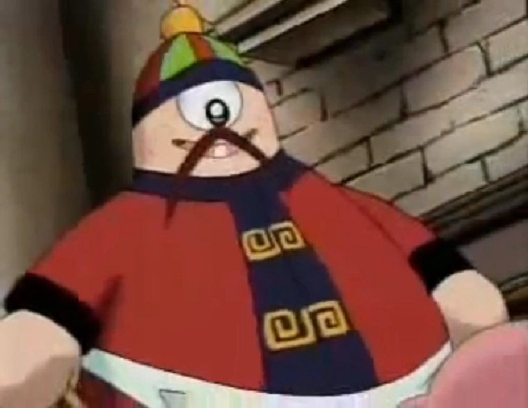 Fryclops is a chef from Nightmare Enterprises who was sent to help take care of King Dedede's problem involving the Waddle Dees revolting against their own king in the episode "Hunger Struck". His special ability is cooking Chinese food that, like that of Monsieur Goan, is just too good to resist. However, the food he creates is sometimes filled with Pufferzine chemicals that were previously used in the NME chips that neither King Dedede nor Kirby could resist eating way back - which means the food cooked by Fryclops can sometimes make anyone who eats it grow huge from eating too much of it. After being delivered to Dedede, he cooks up some Chinese food that the Waddle Dees love so much, and Waddle Doo likes them a lot, too. Just so the Dees can repay him, Fryclops orders for the Dees to attack Kirby, and the pink spud and his friends eventually find many angry Waddle Dees within the dining hall, as well as Fryclops. Kirby sucks up the Waddle Dees, but they don't give him any ability. However, sucking up a tied-up Chef Kawasaki's frying pan allows Kirby to transform into Cook Kirby, and he and Fryclops compete to see who can make better food than one another. At one point, Fryclops makes a giant peking duck, which causes the Waddle Dees to grow huge upon eating just about enough of it. But Cook Kirby wins the competition, in the end, making several foods for the Waddle Dees, which they begin to enjoy even more than Fryclops' own food. Afterward, Fryclops begins to attack Kirby, but Kirby gets the upper hand and fries him with a few smacks from his frying pan, destroying him.