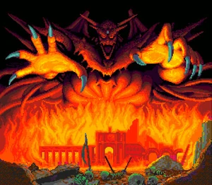 In the PC-Engine intro, he is depicted as a red muscular draconic humanoid demon with a blue gem on his head, three clawed fingers, wings, and spiked shoulders.