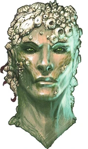 Possibly due to the ordeals he suffered, is skin was covered in barnacles, and his left arm was replaced by a large mechanical crab claw. He wielded a magical trident known as Drown, one of the four elemental tools made by Vizeran DeVir.