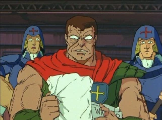 Muhari's son, Haru meets with Geld in his chambers and prepares a suicidal dynamite attack. Just as Geld is about to slice off Haru's hands, Kenshiro breaks in revealing his Hokuto Shinken abilities, forcing Geld to show his wanted poster of his enemy. The general then tries to swing his guandao at Kenshiro, but it breaks. He then tries a sword but gets several punches to the face from the Man with Seven Scars.