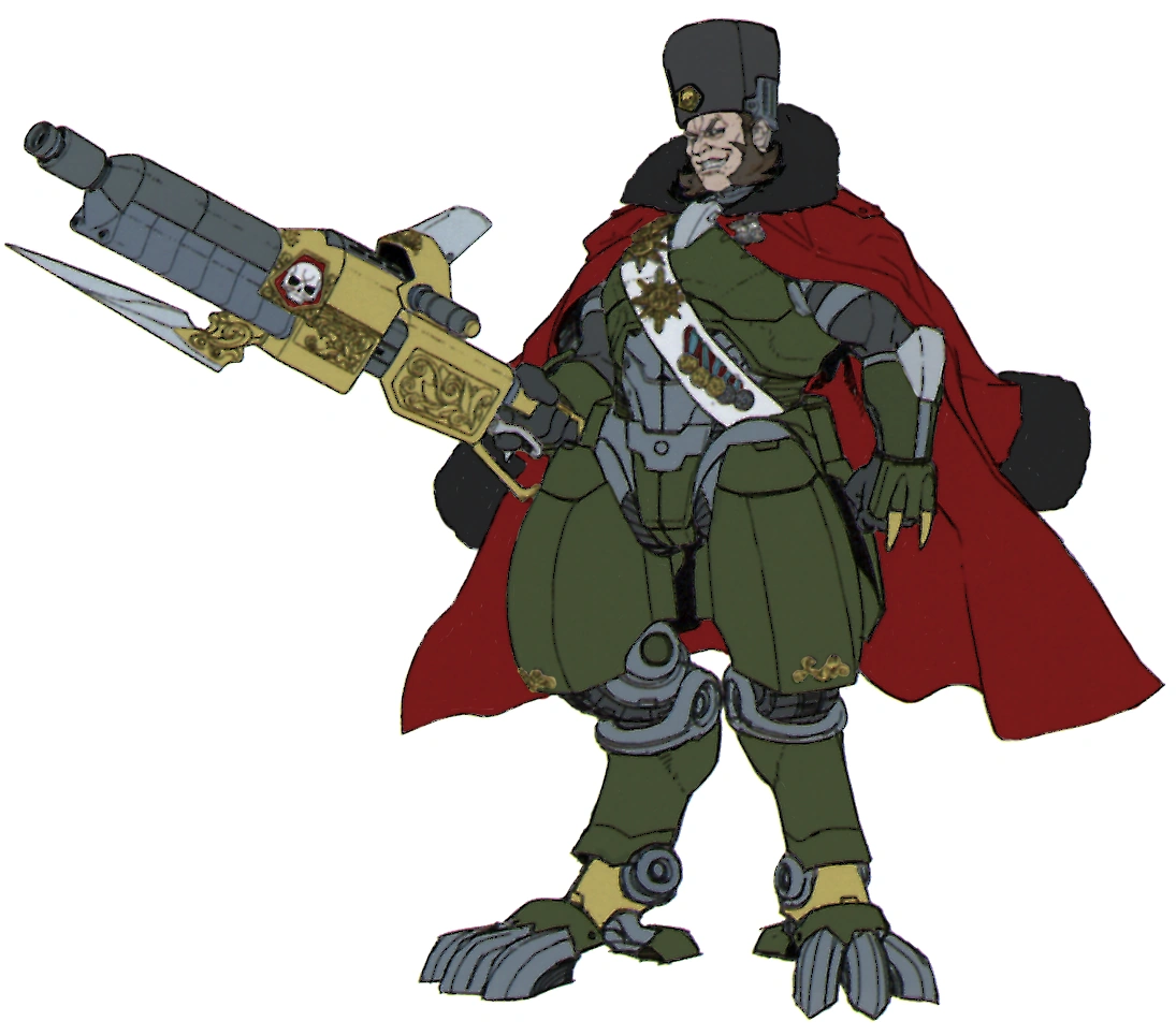 General Mikiel is an old man sporting an almost bald head with some graying hair still remaining. He wears the ruling party's military uniform consisting of a gray long coat and hat with golden shoulderpads, with both coat and hat sporting the red half-star logo of the Kazakh Federation.