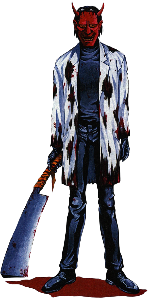 George Maxwell wears a bloody lab coat over a black shirt and pants with black gloves and shoes. As he keeps his face hidden behind a red Hannya mask as well his outfit, it's unclear about his actual appearance. He also wields a giant, bloody hatchet as a weapon of choice.