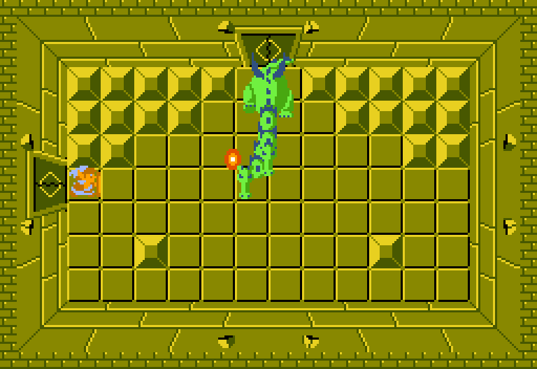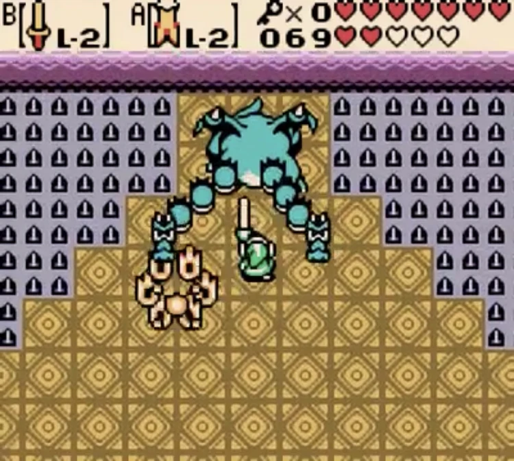 The first phase of the boss fight is similar to the fights from the original game. However, once the heads of the dragon are decapitated, its remains spring back to life and begin attacking Link, charging at him and jumping, which causes the room to shake and makes Link lose his balance. Link uses Roc's Cape to float while Gleeok jumps, then attacks it with his sword when its grounded, eventually defeating it and gaining the Seed of Life.