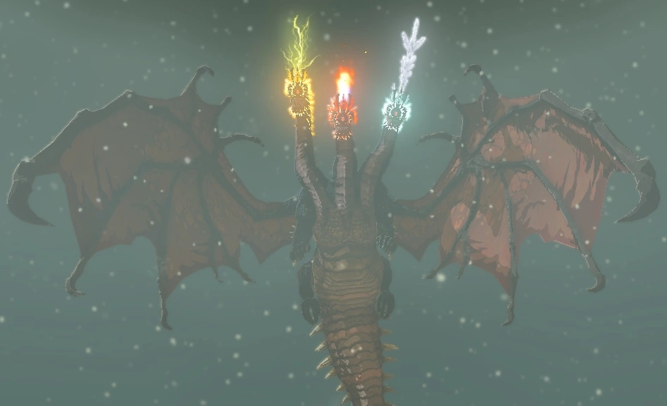 The Gleeoks return in The Legend of Zelda: Tears of the Kingdom, serving as overworld sub-bosses. They can be found across the surface, sky islands and the Depths, and each of them appear in different color variants with their own unique elemental abilities, such as the Flame Gleeok, Thunder Gleeok, Frost Gleeok. Stronger variants called King Gleeok utilize all three elements from each Gleeok.