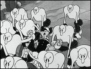 In "Goonland", Popeye went to Goon Island to look for his long-lost father, Poopdeck Pappy. When he got to the island, he noticed there was a big skull rock on the island had a warning on it, saying that humans weren't allowed on Goon Island. Popeye ignored this warning and continued his adventure on the island anyway. Popeye sneaked up behind a goon and followed him closely behind until he led him to the main society, where all the goons were walking around and living their lives. Popeye disguised himself as a goon so that he could sneak in and find Pappy. Popeye's disguise had most of the goons fooled, but shortly after Popeye found Pappy and was sadly rejected by him, a police goon found and captured Popeye. Popeye fought the police goon and the police goon tried to bat Popeye down but Popeye kept tricking the police goon into batting down his own men. Eventually, the police goon finally smacked Popeye and took him away. Pappy noticed this and escaped prison to go save his son by snatching some spinach and breaking out. Pappy found Popeye, tied to the ground and saw that the goons were on a cliff high above him and were trying to push a boulder down on him to crush him. Pappy punched the boulder when it was in mid-air, which sent it flying back up to the top of the cliff, where it crushed the goons. After Popeye and Pappy happily reunited, a bunch of other goons came by and the worked together to beat them all down.