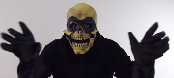 Skellingbones is a skeleton with a dark yellow skull. he wears a black mask, black long-sleeved shirt, and black rubber gloves.