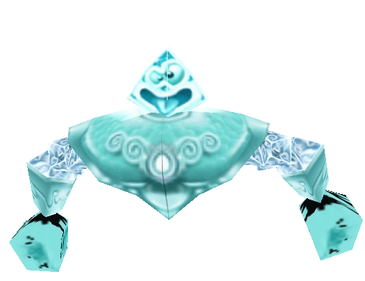 When Rayman comes too close to the fourth Mask, hidden in floating blue crystal in the Iron Mountains high in the clouds, Grolem 13 appears there and shoots a tornado at Rayman. He has more attacks than the other Guardians: he can throw icicles (like Axel) and ice boulders, creates thunderstorms and lightnings or tries to smash him with his fist.