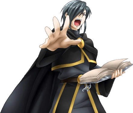Gruda is a pale-skinned mage with black hair and eyes who wears a black robe adorned with gold.