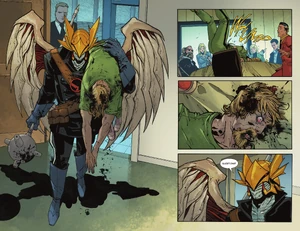 Decades later, Hawkman's path took a dark turn when he murdered Oliver Queen, a wealthy philanthropist turned vigilante. Queen, disillusioned by the depravity of his fellow elites, had taken it upon himself to fight back against the corruption around him. After killing Oliver, bring his dead body and throw it in the middle of the table during the meeting to discuss how to eliminate the threat.