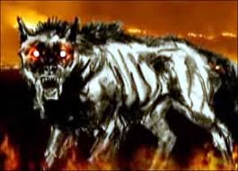 In Greek mythology the hellhound belonged to Hades, the Greek god of death and the underworld, its name in Greek mythology is Cerberus, it has three heads but is still black with razor sharp teeth and super strength, it is used to guard the gates of hell.