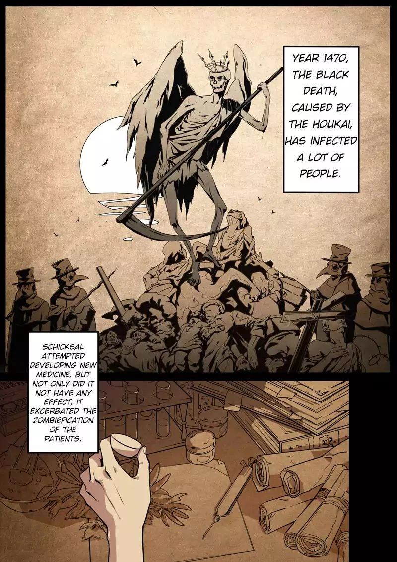 In a matter of a few months, Herrscher of the Corruption had already infected half of Europe with the Bubonic plague, starting officially the Black Death and the Second Apocalypse, wiping out 1/3 of the world's population. There were so many deaths and so many bodies that the authorities did not know what to do with them, and carts piled high with corpses became a common sight across Europe. It seemed the only course of action was to stay put, avoid people, and pray. To save Europe from the Houkai, the current Bishop of Schicksal allowed Otto Apocalypse and his doctors start human experiments with the Purple Box to seek out the truth behind the plague and put an end to not only the plague but also all Houkai creatures of the world.
