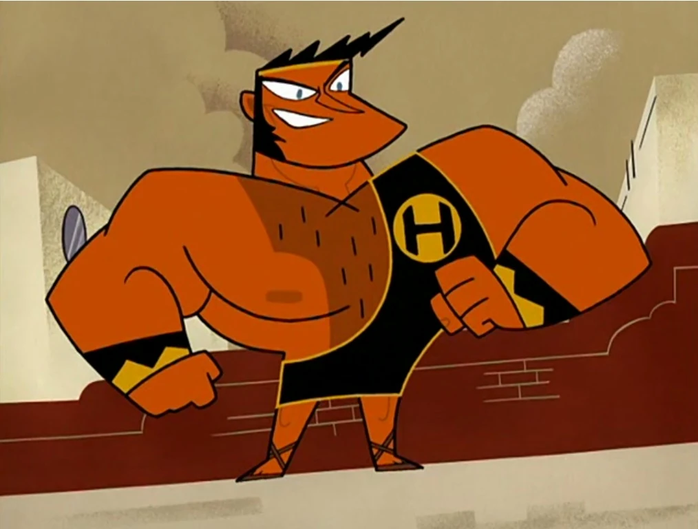 Himcules is a muscular red man in a black toga with a golden "H" button on it. His physical strength increased each time he humiliated and caused pain to his enemies, and decreased when someone started to mock him and ridiculed him. Unfortunately, Jenny had the chance to fight him while she had her prototype nerve projectors on "pain". Himcules of course started bringing the beating onto Jenny, which made him more manly (in which case he gets stronger and more muscular.) About to collapse from the pain, Jenny asks a little girl to switch her nerve projectors to "tickle". All the laughter from Himcule's punches caused him to turn into a literal weakling. Then Jenny delivered the finishing blow by knocking him through a prison wall.