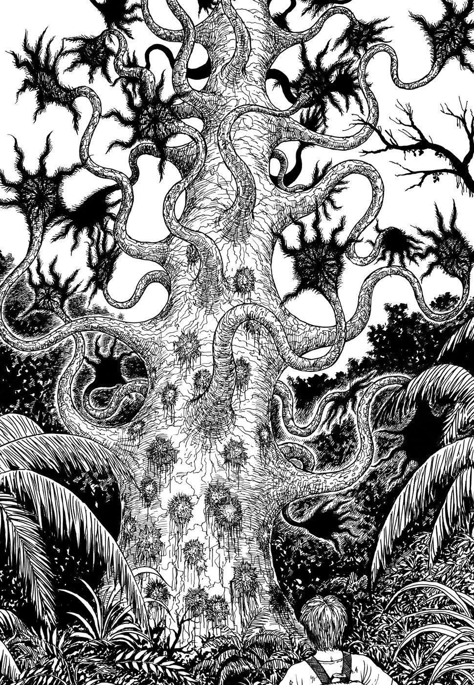 The unnamed Trees, sometimes referred to as the Honey Gods, are the main antagonists of the Junji Ito manga Splatter Film, also entitled Smashed. The Honey Gods are a species of enigmatic, sentient tree native to an unspecified country in South America, which produce a delectable honey-like sap which is supposedly so delicious that anyone who consumes it finds all other food to be tasteless in comparison. Natives to the jungle where these trees grow risk their lives to collect the sap, and consume it under the notion that they must not 'get caught' by the trees when they do so, as the Gods possess a remarkable ability to use their many hand-like branches to strike their 'attackers' from many miles away, using an unusual form of teleportation that allows them to detach a branch and send it great distances across the Earth in an instant.