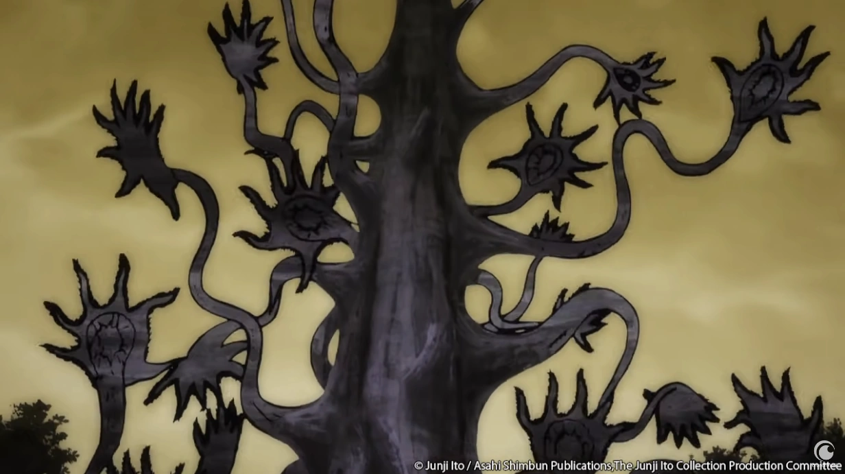 The anime adaptation of the manga in the Junji Ito Collection show the trees to be roughly greyish-brown in color, while their sap is shown to be a rich reddish-orange.