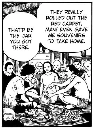 Ogi being presented with a jar of the Honey God's sap, after meeting the indigenous tribe that worshipped the trees.