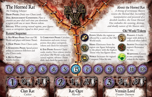 The skaven deity is a fractured and anarchic being, but a terrifyingly ambitious one. The Horned Rat is a grasping, paranoid abomination who seeks to achieve final primacy amongst the Chaos pantheon through the ruination of the Mortal Realms and the annihilation of all those who worship -- and thus empower -- his rivals. Gnawing endlessly at the roots of reality, the Horned Rat creeps through the dark spaces behind the physical plane and stares from the shadows with greedy, glinting eyes. The whisper of his name inspires horror, the scratch of his claws and whiskers and the drag of his worm-like tail through the void driving seers mad and sending ripples of nightmares through mortal minds.[17]