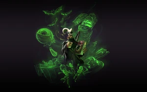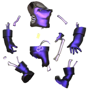The Horseless Headless Horsemann has an eerie ghost appearance, simply appearing as a clothed skeleton with a lit, rotting Jack-O-Lantern for a head. He dons a pitch black cloak, glowing purple and ripped, probably from several battles, as they reveal his bony insides. The cloak has no sleeves, revealing his two humeruses, but his forearm bones and hands are coated in pairs of black, leather gloves. He has a belt wrapped around his waist with an axe shaped, evily grinning head for a belt buckle.