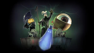 Though he has no pants covering his legs besides a few rippings from his cloak hanging down over them, he dons a pair of thick boots and wields his comically large, grinning axe that decapitates all in its way, The Headtaker. On Carnival of Carnage, he instead wields a Necro Smasher. On Bonesaw, The Horsemann is known as the Hellishly Hollow Horsemann, in this version he appears largely the same, with the exception that he is engulfed in flames and is missing his head, with only a trio of lit candles where his head should be.