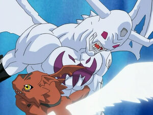 IceDevimon Enhancement Absorbent is the form of IceDevimon after absorbing his Icemon minions, when he fails to corner Persiamon. In this form, he resembles a giant version of IceDevimon with bigger wings and bigger arms. He overpowers everyone until he is reverted to his normal state by the Checkmate Break unison attack of Knightmon and the PawnChessmon (White).