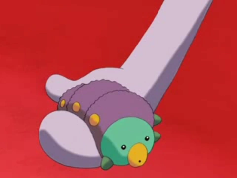 Imohmushii (lit. Worm or Green Caterpillar) is a minor villain that appears only once in the entirety of Kirby: Right Back at Ya! for a very short portion of episode 21, "The Empty Nest Mess". It is a caterpillar that Escargoon found in King Dedede's Castle garden and uses it as a demonstration for his Insta-Monster-Mixture formula that he had created. The caterpillar was injected with Escargoon's serum, and eventually grew and transformed into a huge monster mutant that squashed King Dedede and Escargoon. After its short-lived rampage, Imohmushii picks up Escargoon with his mandibles and swings him about virtuously. It was at this exact moment when Dedede happily realized that the invention worked and that he could make all the monsters he wanted without having to spend money buying them from Nightmare Enterprises. Imohmushii never appears again after this scene, so whatever happened to him after his small appearance in the beginning of the episode is unknown.