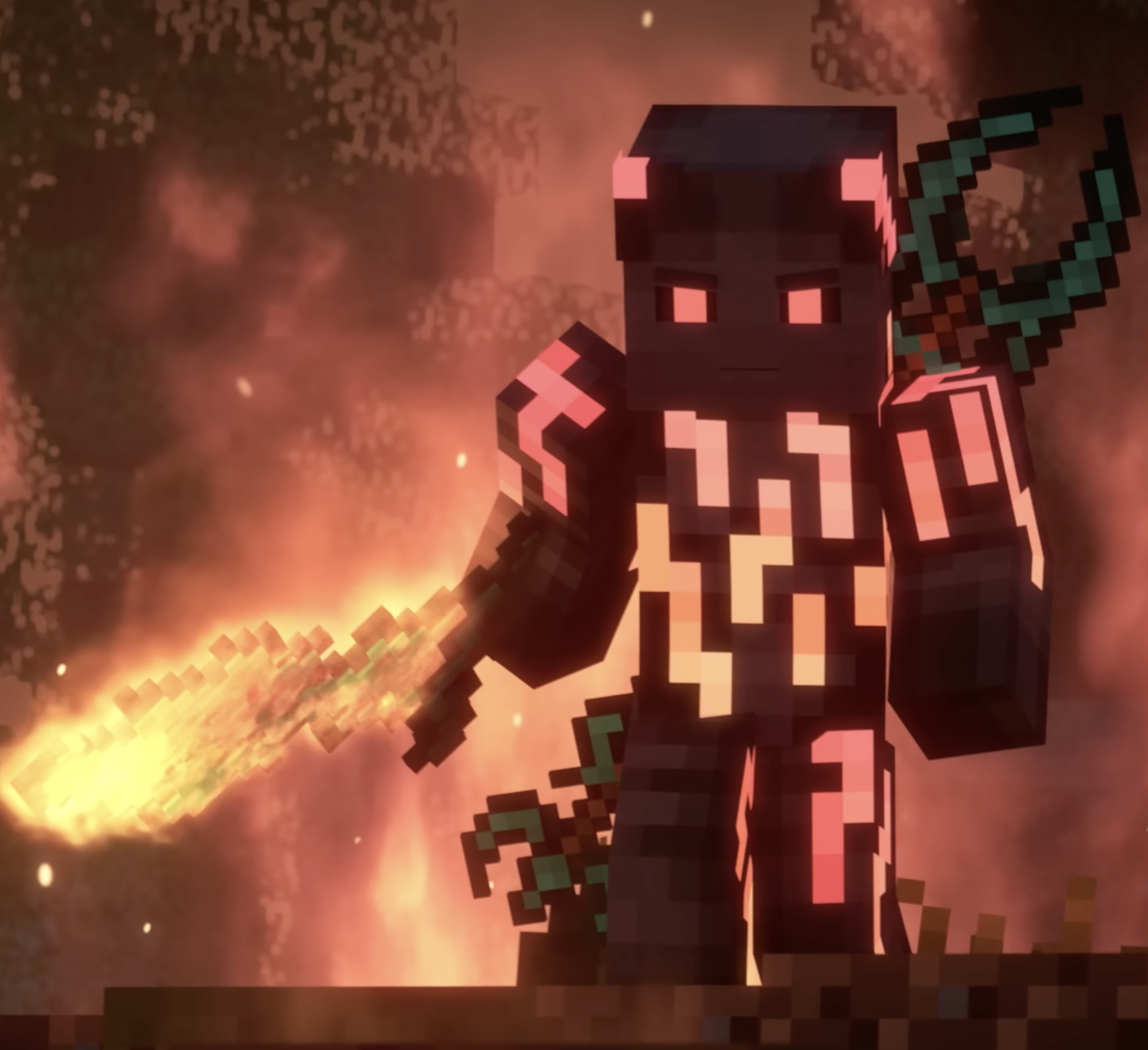 He is equipped with a flaming broadsword and a voltar, which can retract when not in use. His broadsword's enchantment glint is red, representing his clan.
