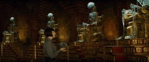 | ~ Irina Spalko's bewilderment of discovering the Crystal Skeletons, analyzing that they have a hive mind before putting the Crystal Skull back to its skeleton. |