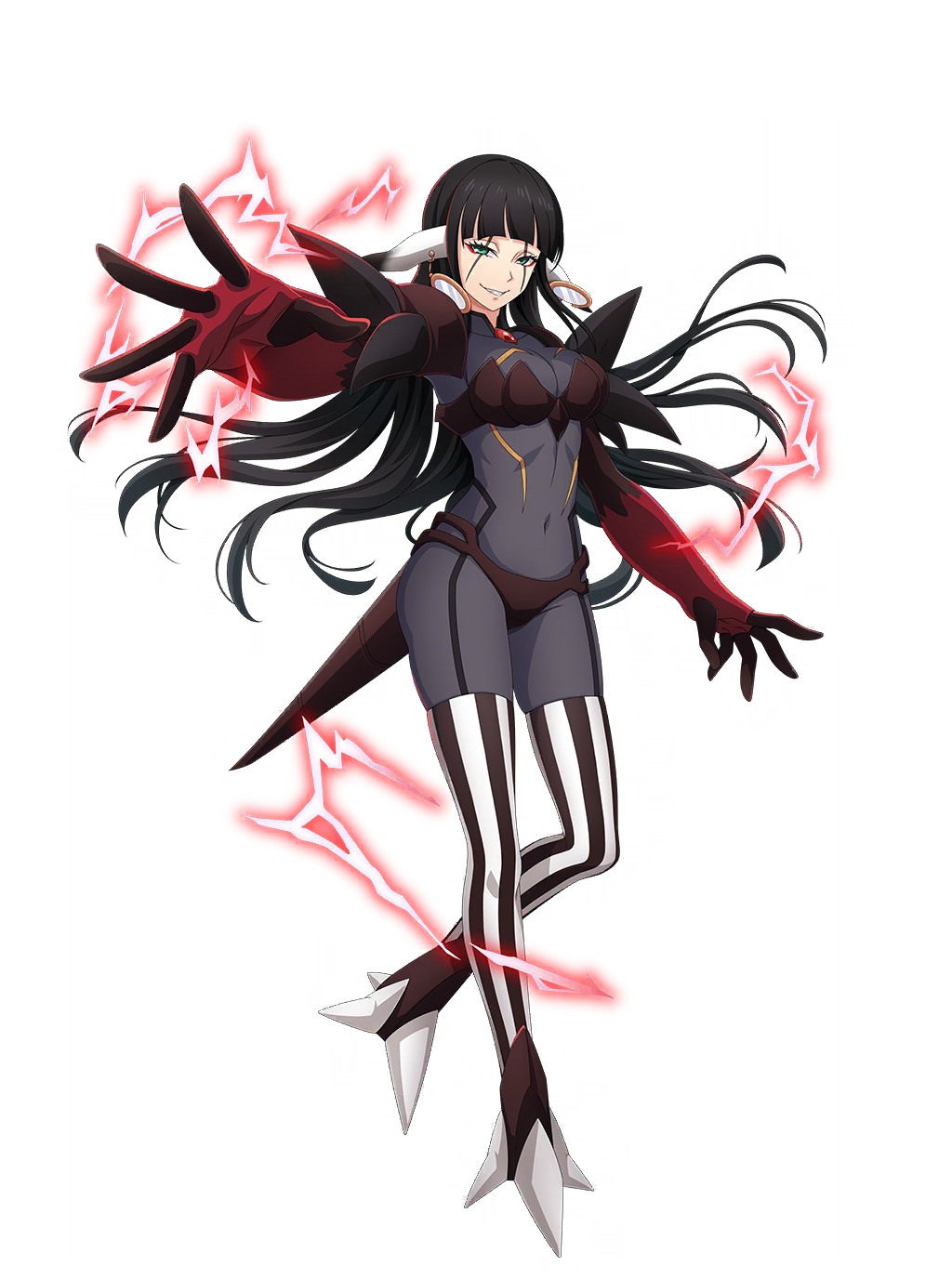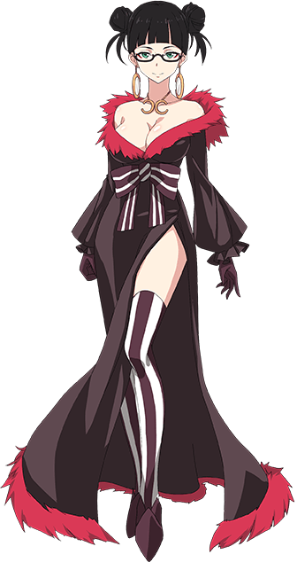 In her Evolved form when powering herself up with Veldora Against's Magicules, she has black skintight suit-like outift on where she looses her glasses, has bull like horns and mirror earings.