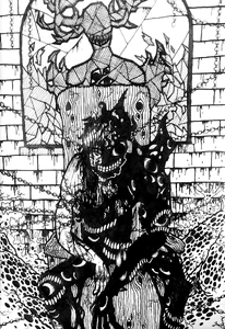 Our cardinal choked on his own blood while Jeser laughed his way out of a window. […] My elite men and I had travelled far from the holy city in pursuit of Jeser until we eventually caught up with him in the woods. He had a smile too big for the face he wore, and we then noticed the Faceless emerging from the shadows. Jeser quickly changed himself into a dragon, and his trap was set in stone. I immediately took to fighting Jeser while the others defended. During our battle, some of the Faceless would transform into my comrades, and attempt to approach close enough to stab me. Meanwhile, I had to block constant streams of fire. Then we heard the trumpets. The sky became crimson, and instead we heard the beating of drums. The invasion had begun on our realm. We quickly realized that Jeser had lured us far from the holy city to weaken its defenses. He laughed before taking flight. The Faceless grew wings and followed their master. Our end was coming.
