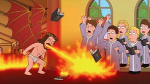 - In "You Can't Handle the Booth," Jesus suddenly goes on a violent, murderous rampage, where he grows demon wings, develops red glowing eyes, and starts breathing fire all over the churchgoers at the church he's in. Jesus burns a bunch of people up in flames, destroys church property, and blows the entire Holy Christ Church to smithereens, killing dozens of people and injuring many more. The Griffin Family, who are among the few survivors of the incident, are approached by Jesus later, who apologizes for his violent act of terrorism and says that the reason he did what he did is that his girlfriend broke up with him and took his dog with her and on top of that, he skipped breakfast. Jesus follows this by asking for forgiveness, and Chris says that because he is Jesus Christ, they are obligated to forgive him, even though he doesn't deserve it. Lastly, Jesus asks if he can crash in the Griffins' garage for a few days. Chris notes that this is a reason why you should never go to church.