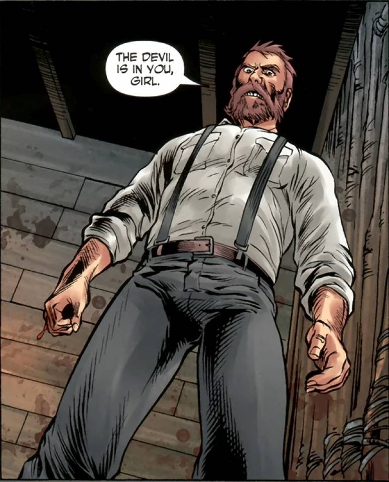 Meanwhile, a large group of the Crossed has used their tracking skills from a pile of the Pratt's horse's dung to make their way to New Paradise. Adaline tells her father that she wishes the incoming horde kills them all as it is no paradise at all, just "the insanity of a sick old f*ck who likes to screw little girls", and Joe punches her in the face once again. Adaline laughs at her father and Joe suspects she's possessed by the Devil, and Adaline questions if that is why he's never tried to rape her or because he knew she's the only one who would fight back against him.