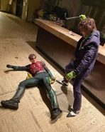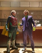 • Some of the Joker's actions throughout the Titans series are references to two well-known DC comics; His paralyzing of Barbara Gordon references Batman: The Killing Joke, where he invades her apartment and shot her in the spine, leaving her paralyzed and resulting in her retirement as Batgirl and her rise as Oracle. Joker beating Jason Todd to death is a reference to A Death in the Family, where he did beat Jason with a crowbar but didn't kill him with it.