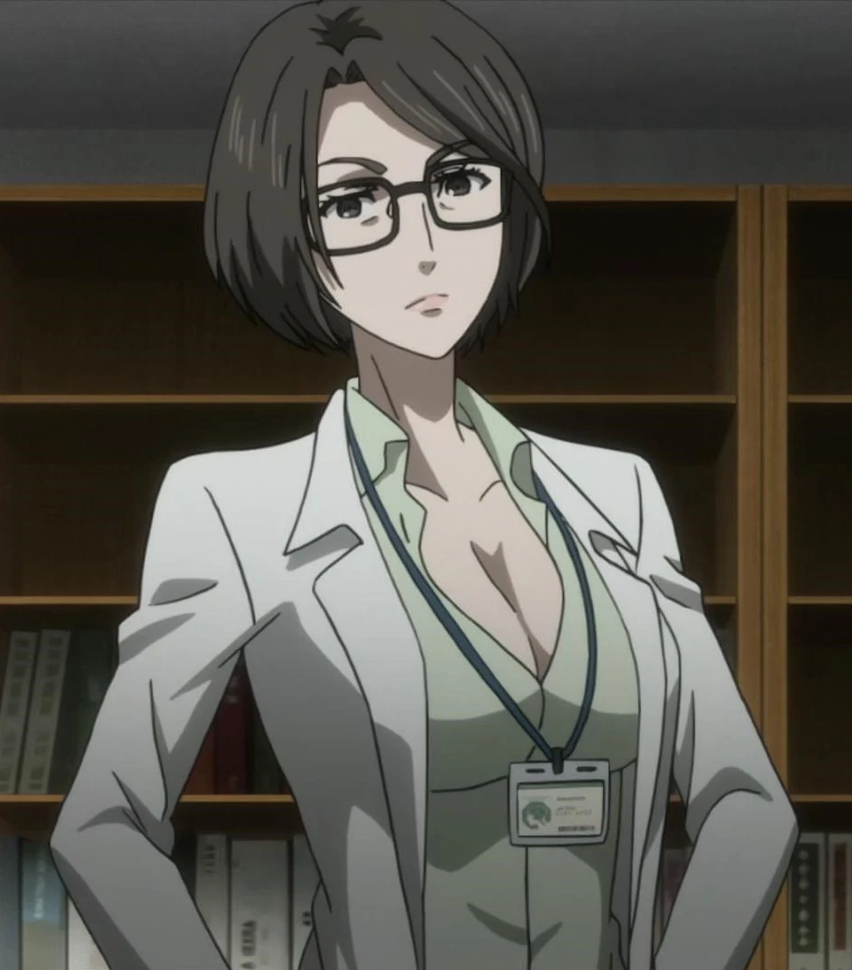 Reyes is a tall, middle-aged woman with glasses, short brown hair ,a lab coat, and blouse that it slightly unbuttoned up top.