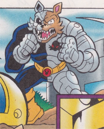 Kage is a Dingo with brown fur and brown eyes. After throwing in with Eggman he turned himself into a cyborg with the right side of his body being made of out of a metallic white color with the left side of his body all being cybernetic with the Eggman logo on his chest. The right side of his body had a black uniform with yellow belt with a red center.