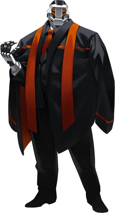 As the Director of Kaiser PMC, he appears to be a muscular robot with four orange eyes as a pattern wearing a black suit. He is also accompanied by a black dress shirt, a black lounge jacket adorned with silver or white stripes, an orange necktie, black trousers embellished with silver or white lines, and either black or brown footwear. He was often seen wearing an outer jacket featuring an orange pattern and carrying two pieces of orange fabric.