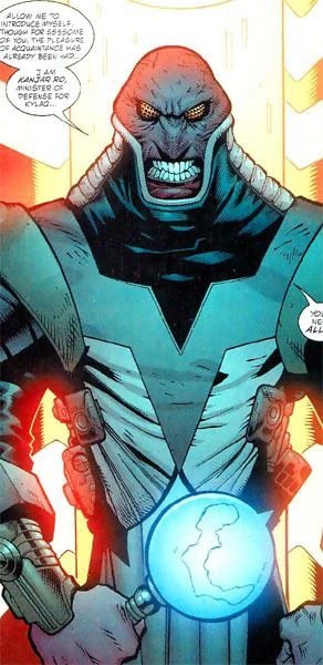 Kanjar-Ro is later seen in the Green Lantern Corps prison cells on planet Oa, and is present during a mass breakout. Unwilling to be killed by the rioting prisoners, The cowardly Kanjar bargains with Kyle Rayner, offering to help quell the riot in exchange for leniency on his sentence. This pact later saves Kanjar's life. The Guardians had ordered the Alpha Lanterns to kill all the escaped prisoners, and Kyle is able to convince the Guardians to spare Kanjar by citing his assistance during the riot.