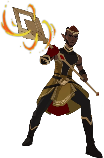 Karim is a lanky looking Sunfire Elf, who happens to be a mage. Like most of his species, he has dark skin and dark orange eyes. He has a gold headpiece that holds back his short hair while both sides of it is shaved and has a unique looking beard. Since Karim is a mage, he of course would present himself as such. His outfit consist of a unique looking cape that covers half of his body and a dark tunic that is similar to the Moonshadow Elves and a belt around it. Besides that he wears jewelry like earrings, the golden headpiece, and a ring, all of these shows his status as a prince of the Sunfire Elves. Karim also holds a staff around as a weapon but it broke after his fight with Janai.