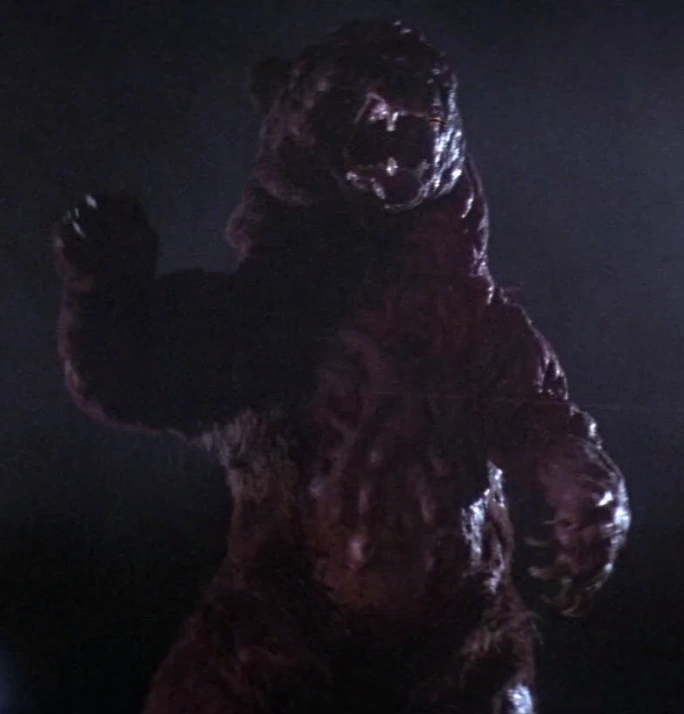 In the film, Katahdin has the appearance of a giant bear that walks on two-legs and has half of her body mutated to a high degree. On her right side, Katahdin has an appearance similar to a common grizzly bear, except she is missing fur in some sections such as on her arm, back and legs. She also has a brown-ish gray colored eye, her neck connected to her hump and a twisted back. Unlike her right side, which was fortunate to maintain most of her original appearance, her left side was drastically altered by the methylmercury. She lost her fur, which is now replaced by skin turned into deformed pink-ish red colored flesh running from her head to her waist, which looks melted. On this side she also lacks of her eye, her lips, has her ear deformed and her upper mammary glands transferred to her stomach, remaining on top of the lower ones. One of the most remarkable things about Katahdin is her great size, standing 10.5 feet tall, considerably taller than a normal grizzly bear, which stands 7 feet tall on two-legs.