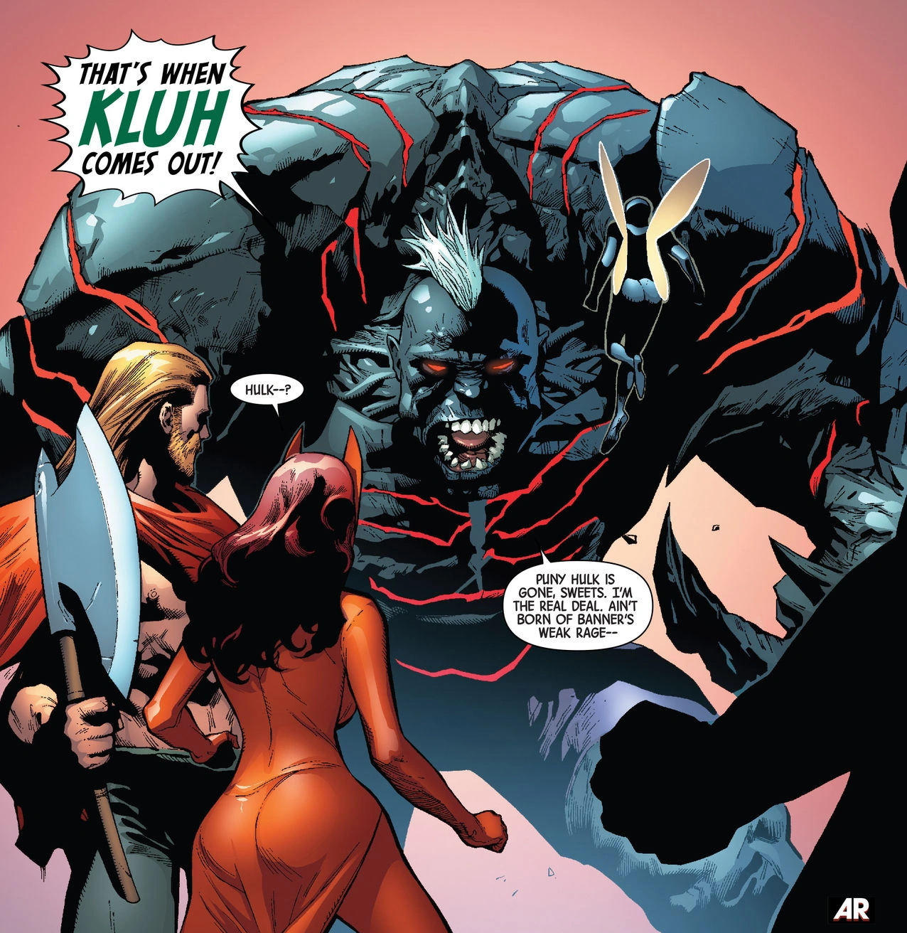 Kluh, in fact, is born of Hulk's own rage and is repressed by Hulk as such. This shows how dangerous Kluh is, since even during "World War Hulk", the Hulk would have been fighting off Kluh's influence in order to stop the monster emerging. During the "AXIS" storyline, however, Hulk was unable to stop Kluh from emerging and the monster took control, he quickly showed his power as he decimated the Avengers with ease.
