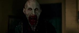Kurt Barlow is a bald vampire with yellow eyes, long claw-like black fingernails and partially long, slender fingers, with pale white skin, along with bulging veins on the back of his head along with pointy ears. He sports a black sleeve and black and red clothing. He almost always has blood smeared around his mouth.