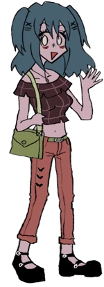 Lacey is a tall girl, with fair skin, and blue hair. She wears a necklace, a brown croptop, orange jeans, and black shoes. She also carries around a green purse.