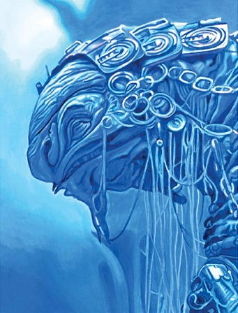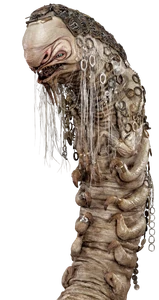 Proxima appears to be a giant tan worm with many tiny insect-like legs running down the length of her body. She has green eyes, sharp teeth, and long white hair running down the top of her head. Her body is covered in various jewelry-related items. She appears to have a crustacean-like mass on her back.