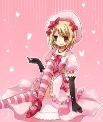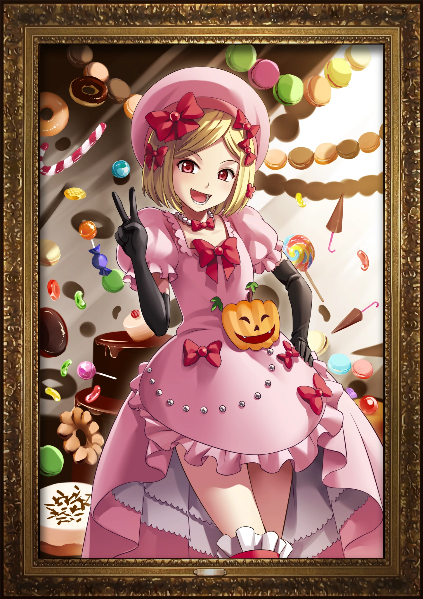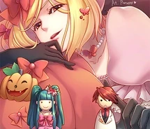 She wears a pink hat and dress and wears white-and-pink-striped stockings and shoes and bows of a darker shade of pink, almost red. She also wears black long gloves. The aforementioned bows are to be found in her hair, on her hat, on her dress and on her shoes. Some of them look a little bit like candies in shape. She also wears a pumpkin on her dress and a few green leaves. You can also see a row of small white pearls on the bottom part of her dress.