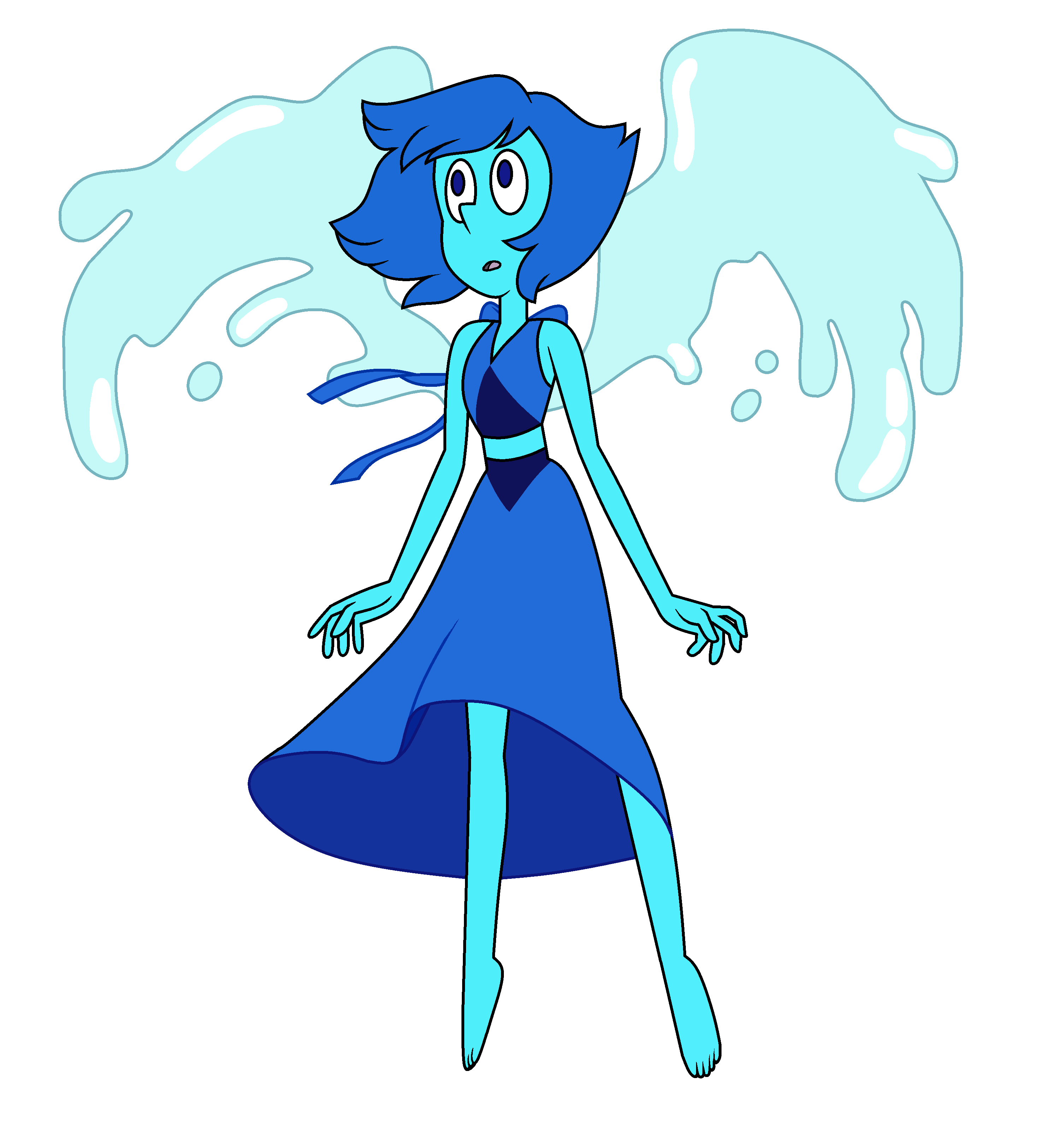 Having the name based on the deep blue metamorphic rock of the same name, Lapis Lazuli is a blue Gem with a light blue dress. When her gemstone is healed, she gains the ability to generate wings made out of water. She has a tear drop shaped gem on her back. Lapis' slender and somewhat short build gives her that of an appearance of an older teenage girl. Before her gem was healed, her eyes were mirror-like.