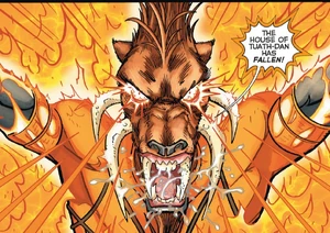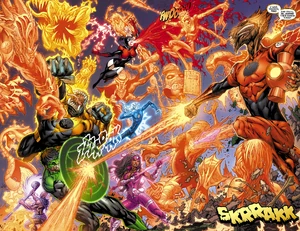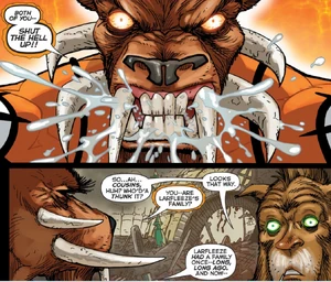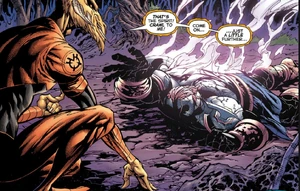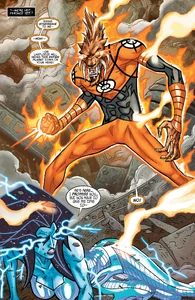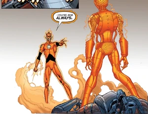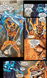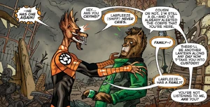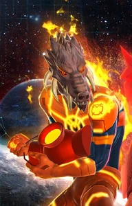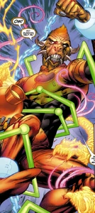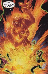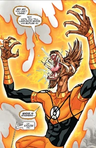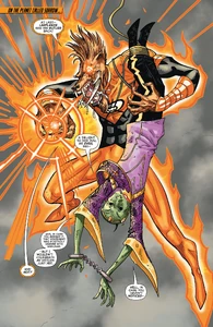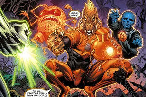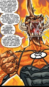 Images of the avarciously thievish Orange Lantern Corps member Larfleeze from DC Comics.