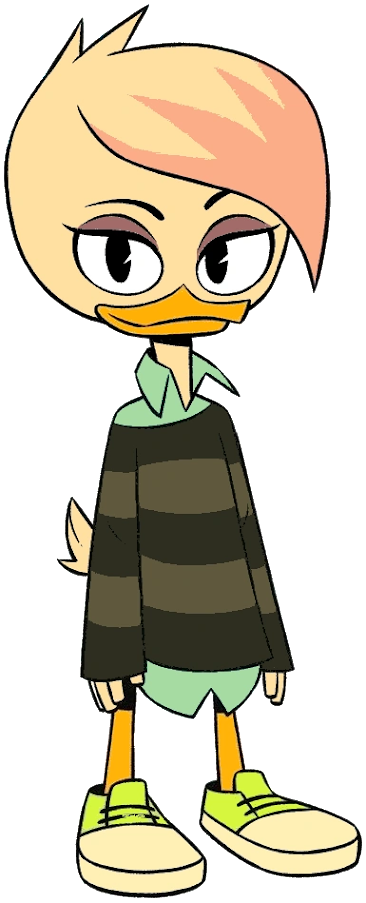 Lena is a teenage duck with white hair with a pink end. She wears a black shirt with gray stripes, a teal shirt inside, and light green shoes with white tips. Her pajamas consist of a white shirt, black shorts, and a black undershirt inside. She also wears a black necklace.