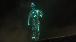 The Leviathan is the final weapon of Vandal Savage during his conquest of London. After his daughter Cassandra has been captured by Rip Hunter and his team, he orders his commandant to send out the Leviathan to retrieve Cassandra as wells as burning down the refugee camp. The Leviathan attacks the Waverider, grabbing it and lunging it far away. The Waverider crashes into the ground far away from the battlefield. After making sure that everyone is alive, Rip and his team are told by Gideon that the Leviathan is advancing and will arrive at their location in one hour. To be able to defeat the Leviathan, Jax modifies Ray Palmer's A.T.O.M. suit to not shrink him but make him much larger to ensure that he has a chance against the giant robot.