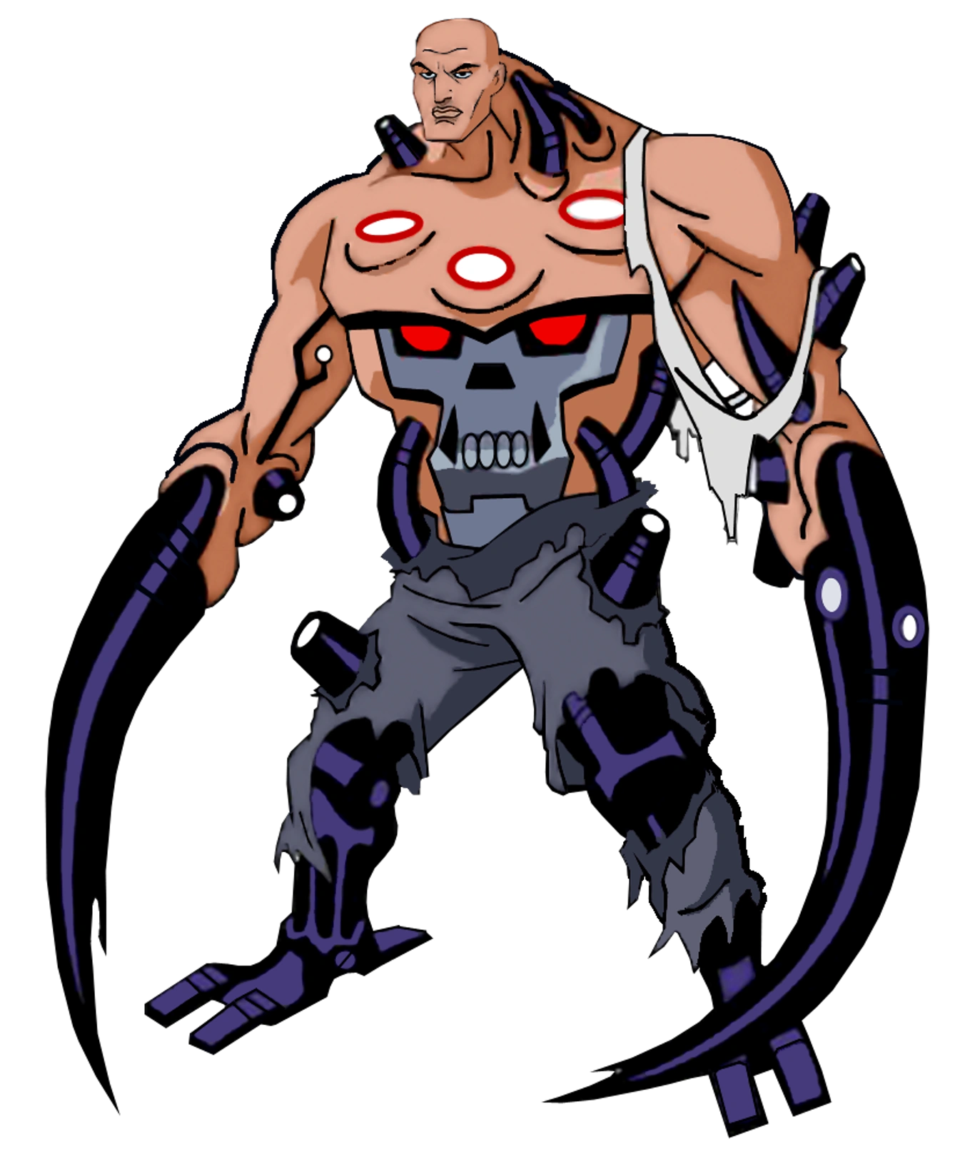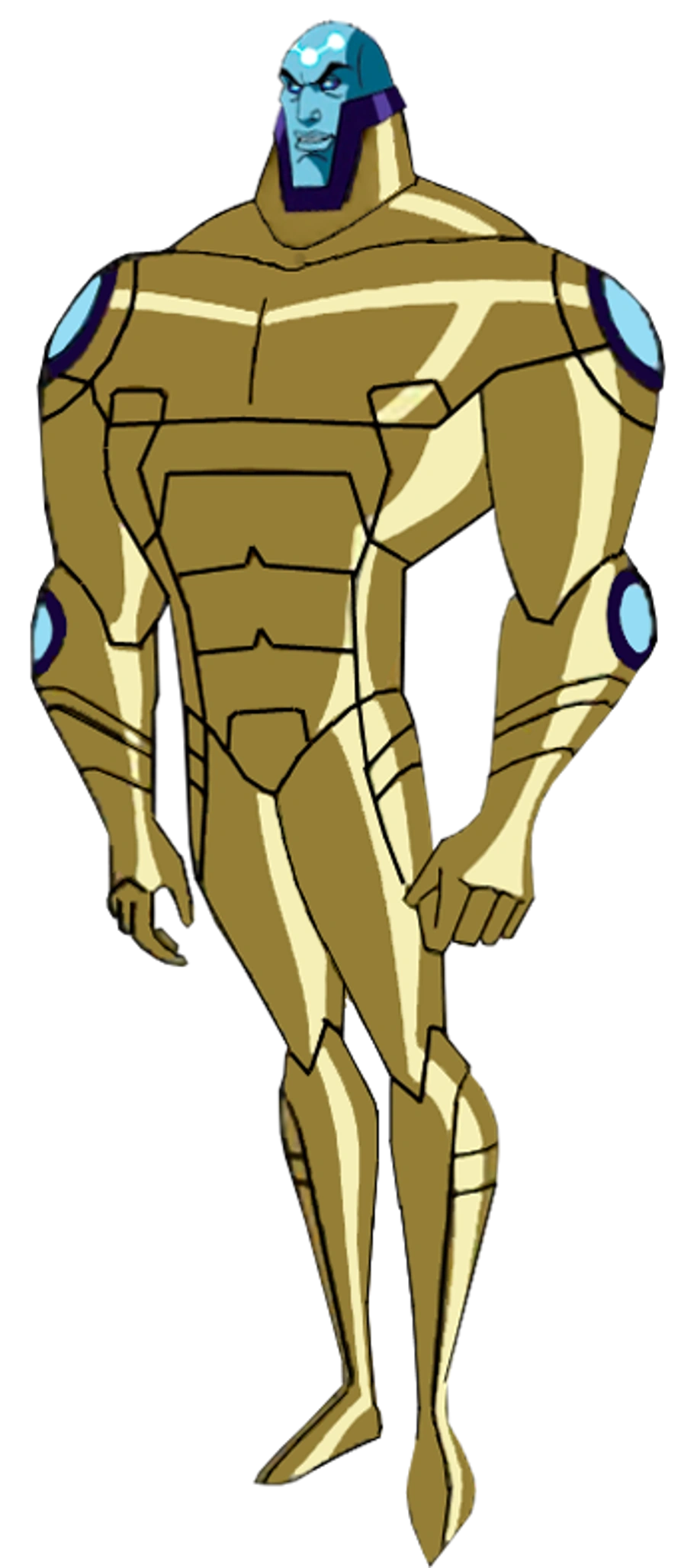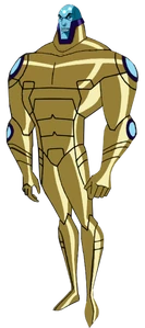 As a supervillain, he boasts a simple yet deceptively powerful combat suit with a purple or tan shirt, green pants, boots, a lasergun holster vest and a technologically advanced belt that served as a shield and other purposes, similar to Batman's utilty belt. He also wears his famous green and purple armor that leaves his head exposed.